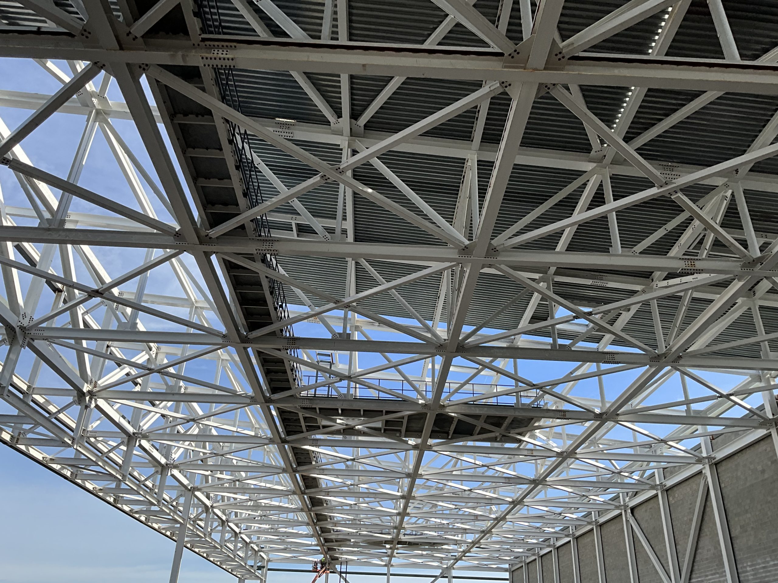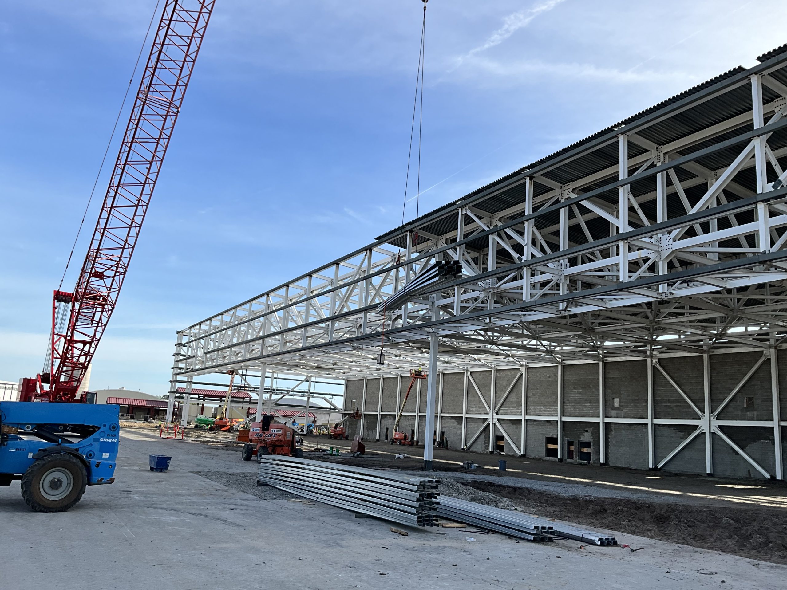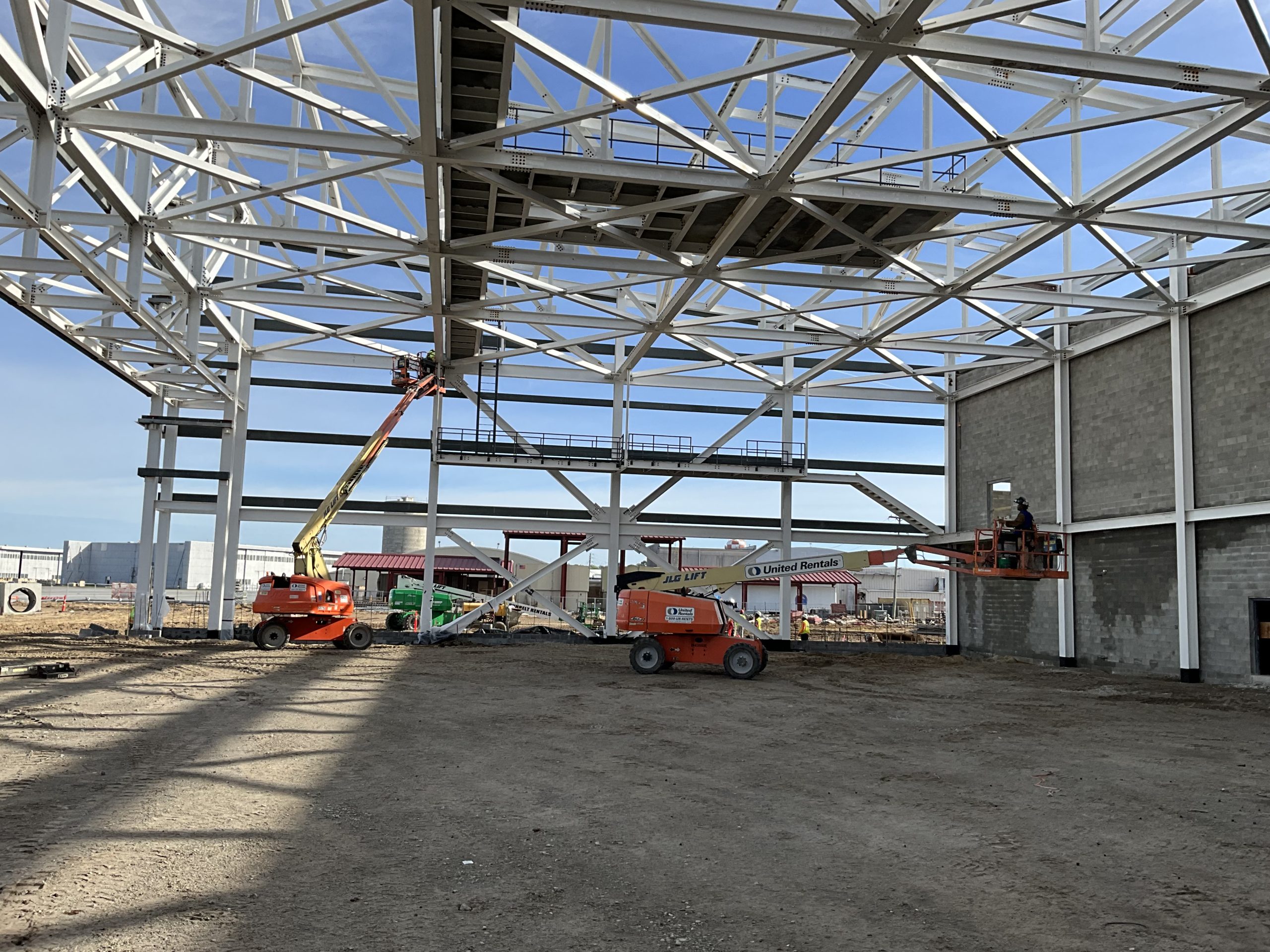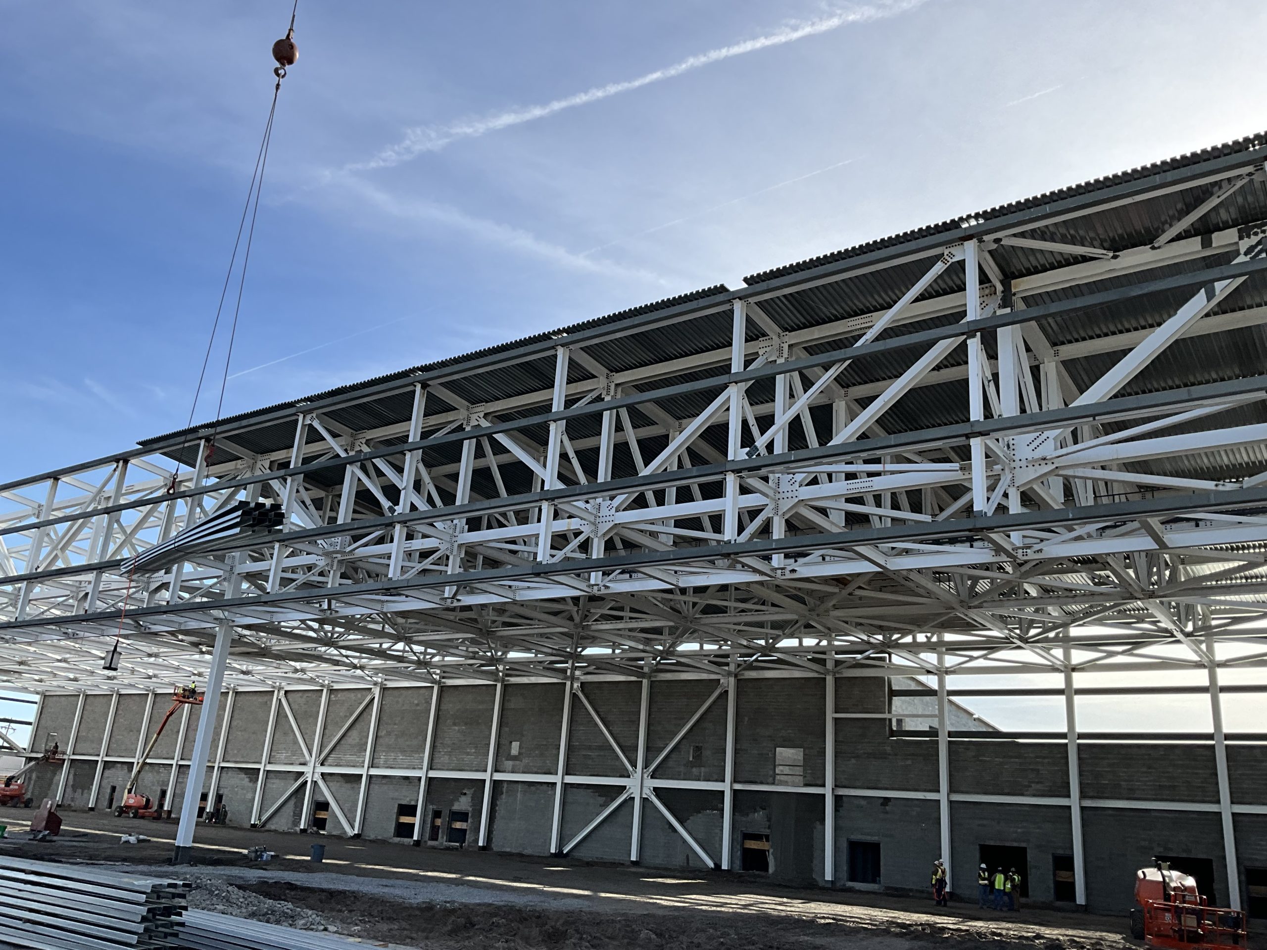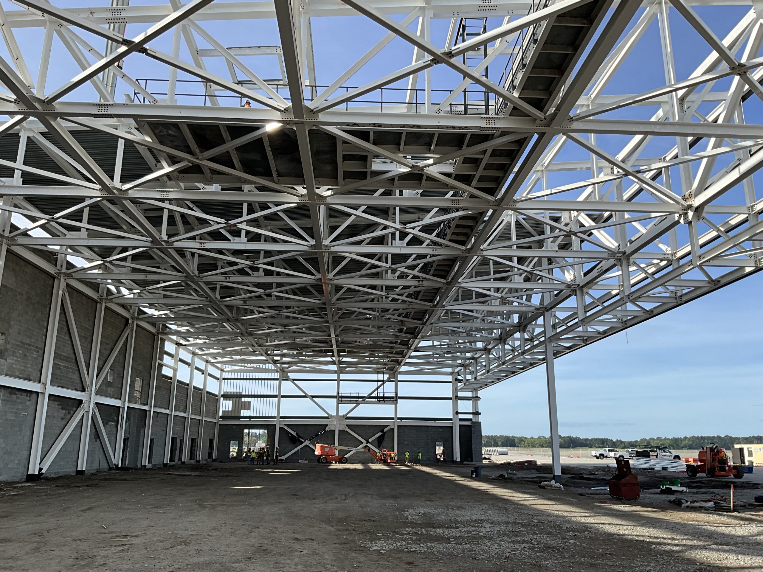 This hangar project on Hunter Army Air Field features deep, long span trusses running perpindicular to one-another. NAFCO used a mix of shop and field assembled trusses and provided shop application of the sophisticated military paint system to minimize field work. Hangar erection was completed in a duration of under 3 months.