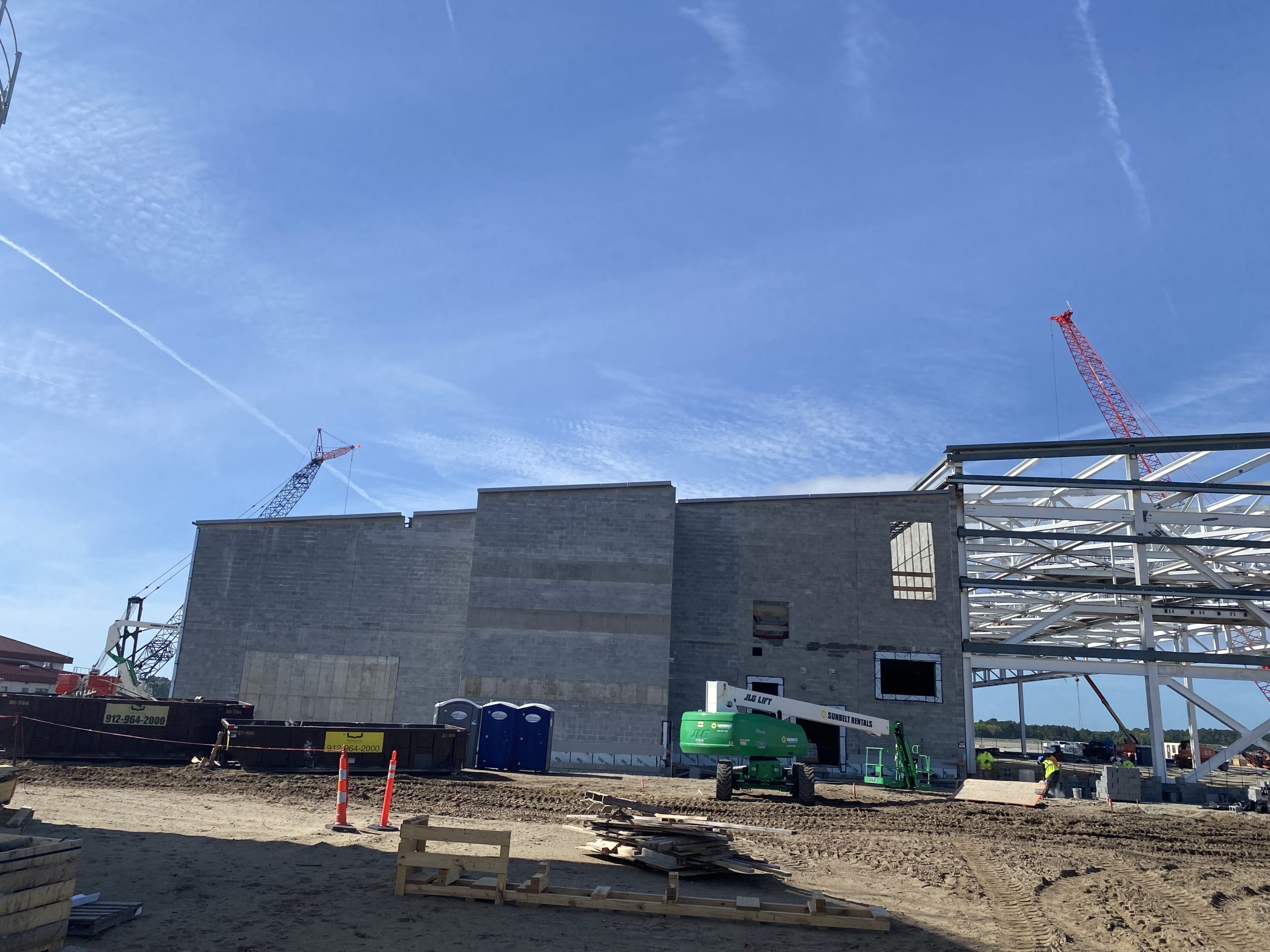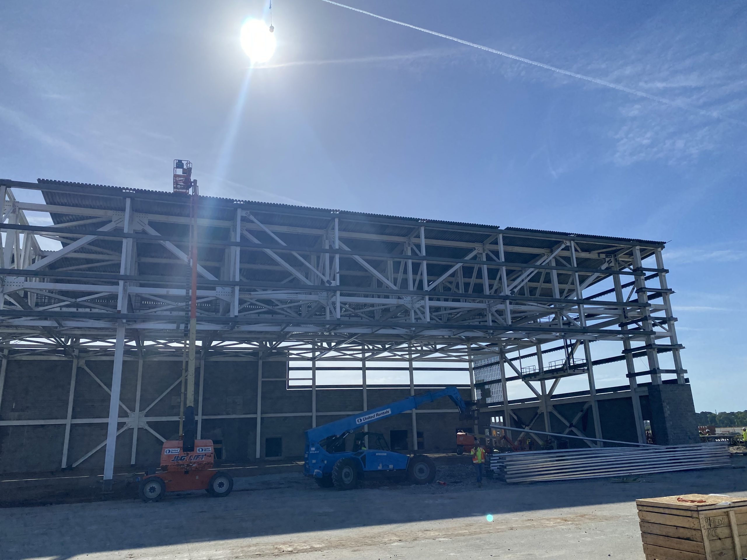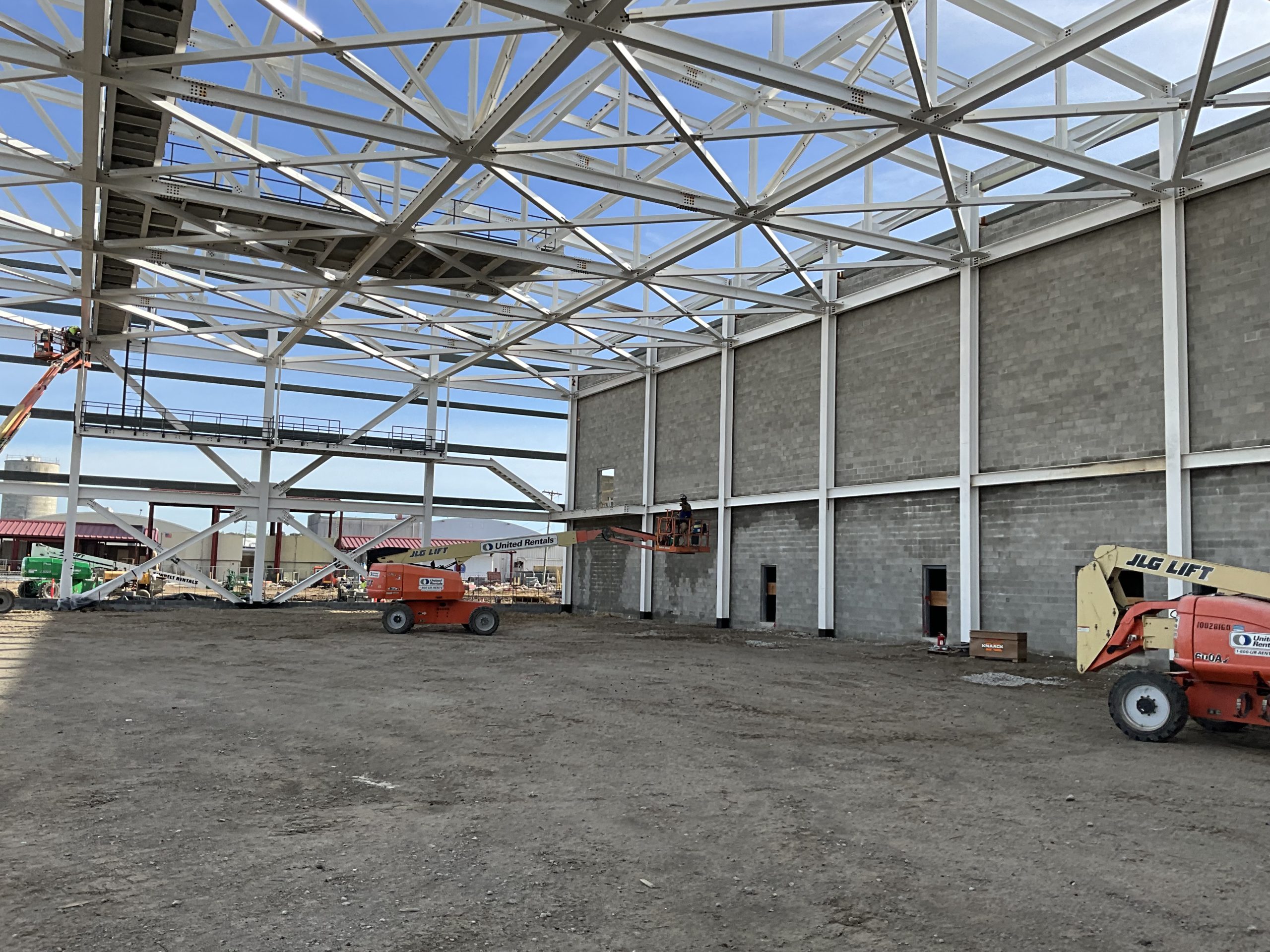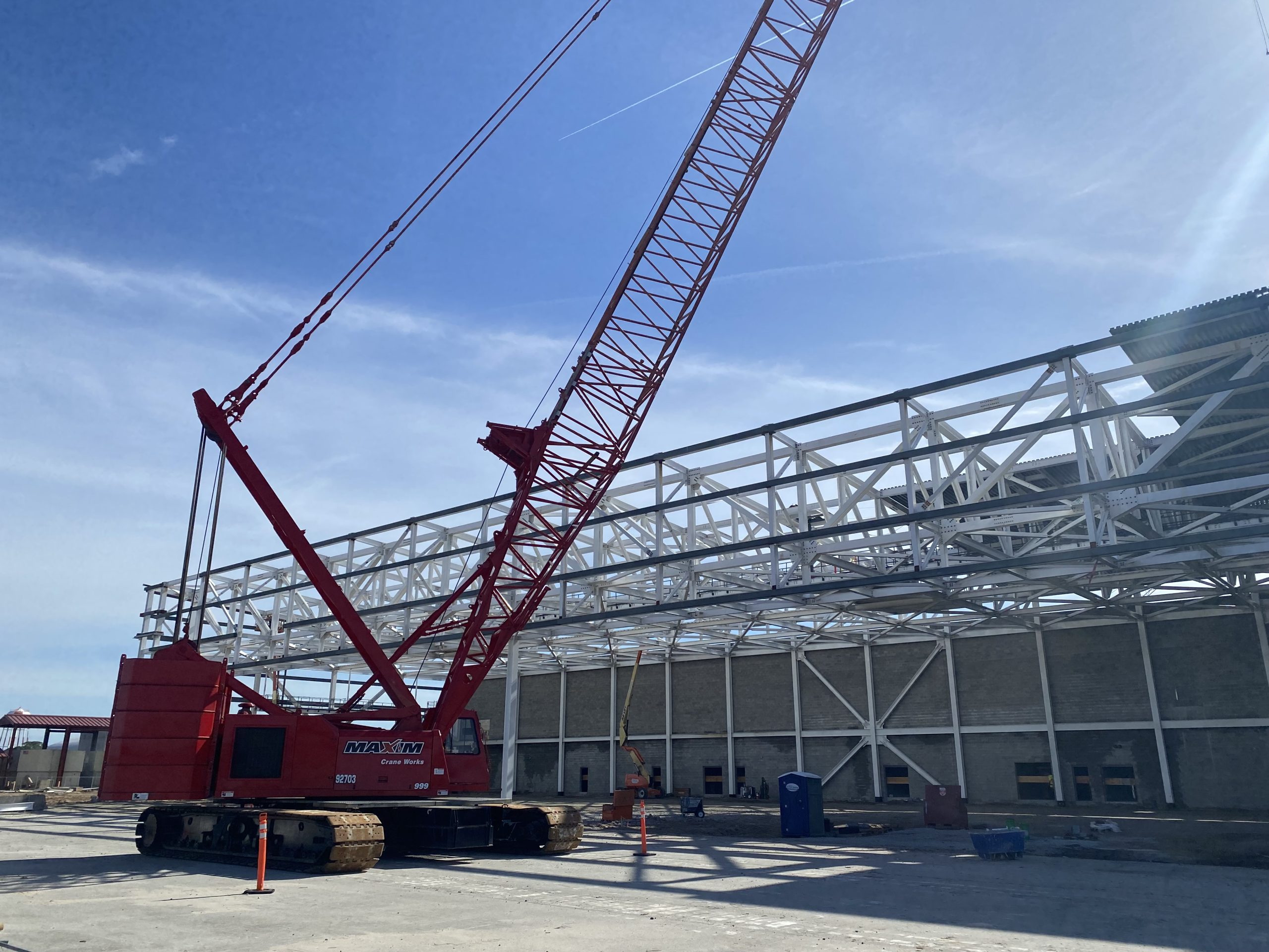 This hangar project on Hunter Army Air Field features deep, long span trusses running perpindicular to one-another. NAFCO used a mix of shop and field assembled trusses and provided shop application of the sophisticated military paint system to minimize field work. Hangar erection was completed in a duration of under 3 months.
