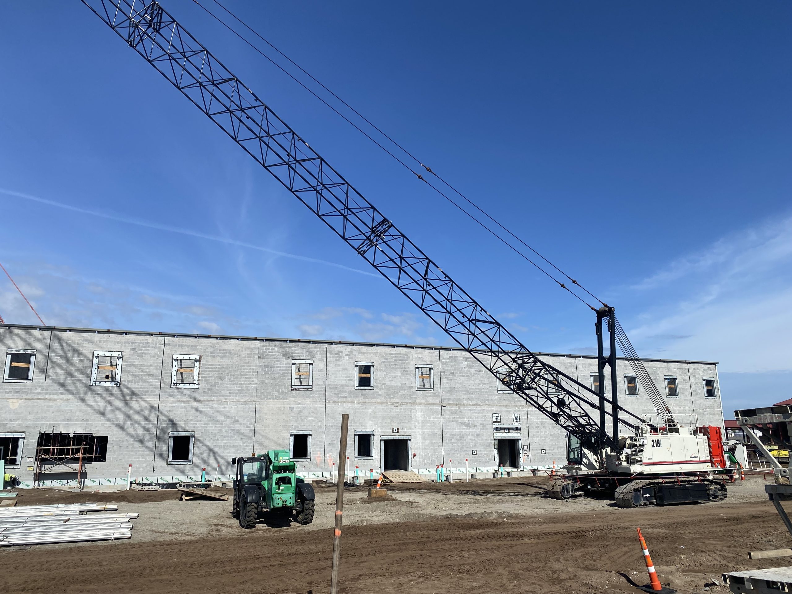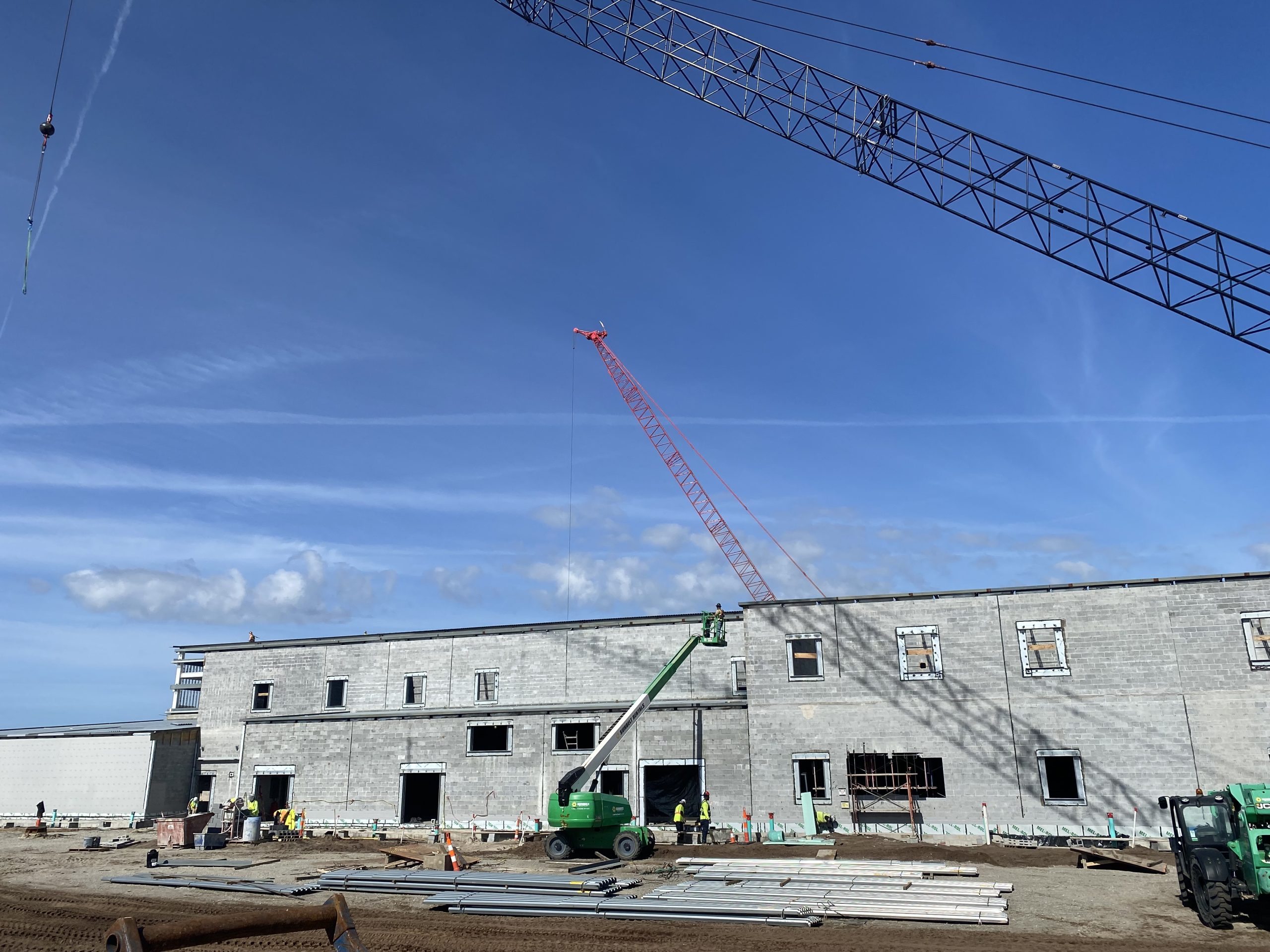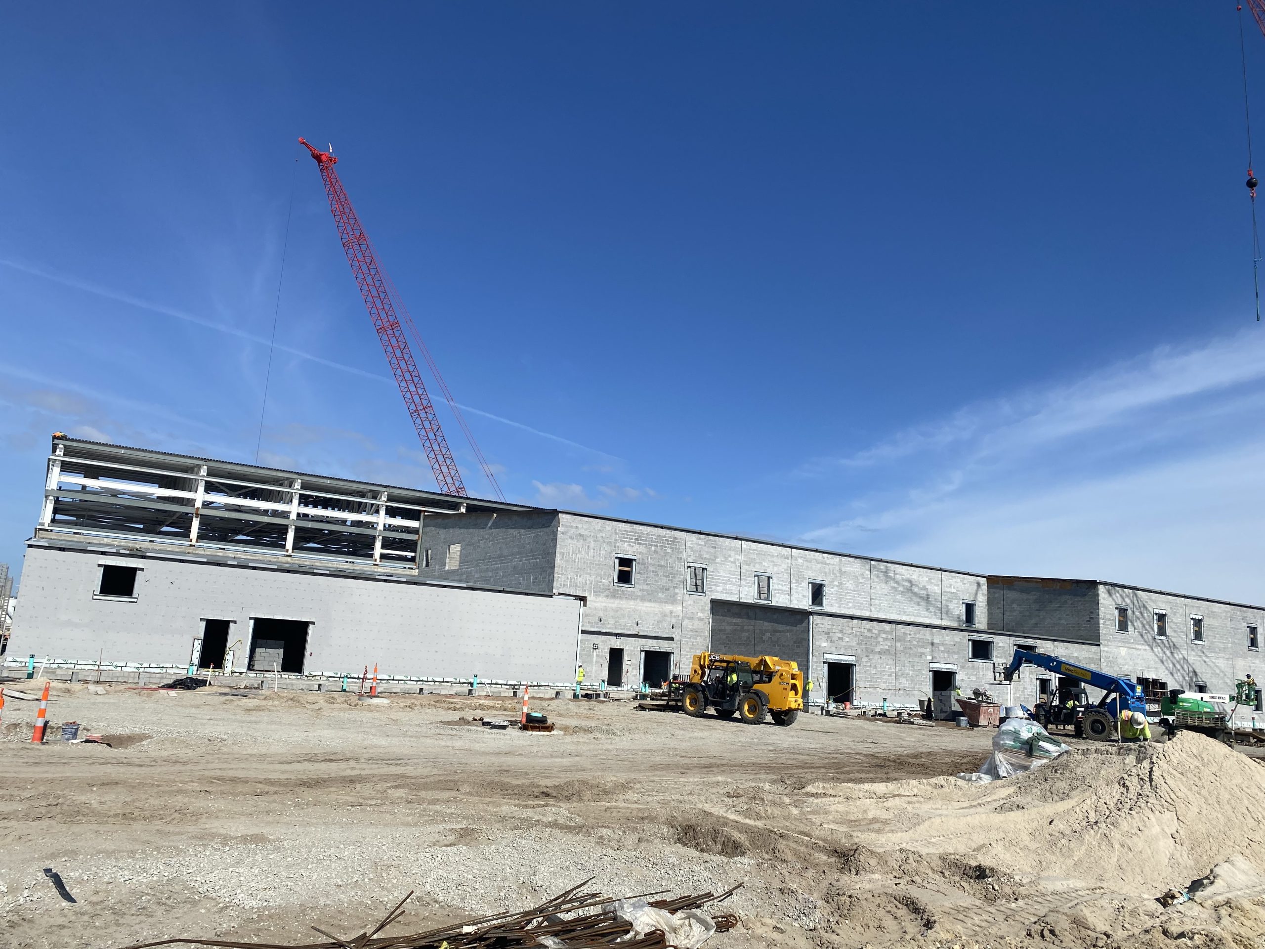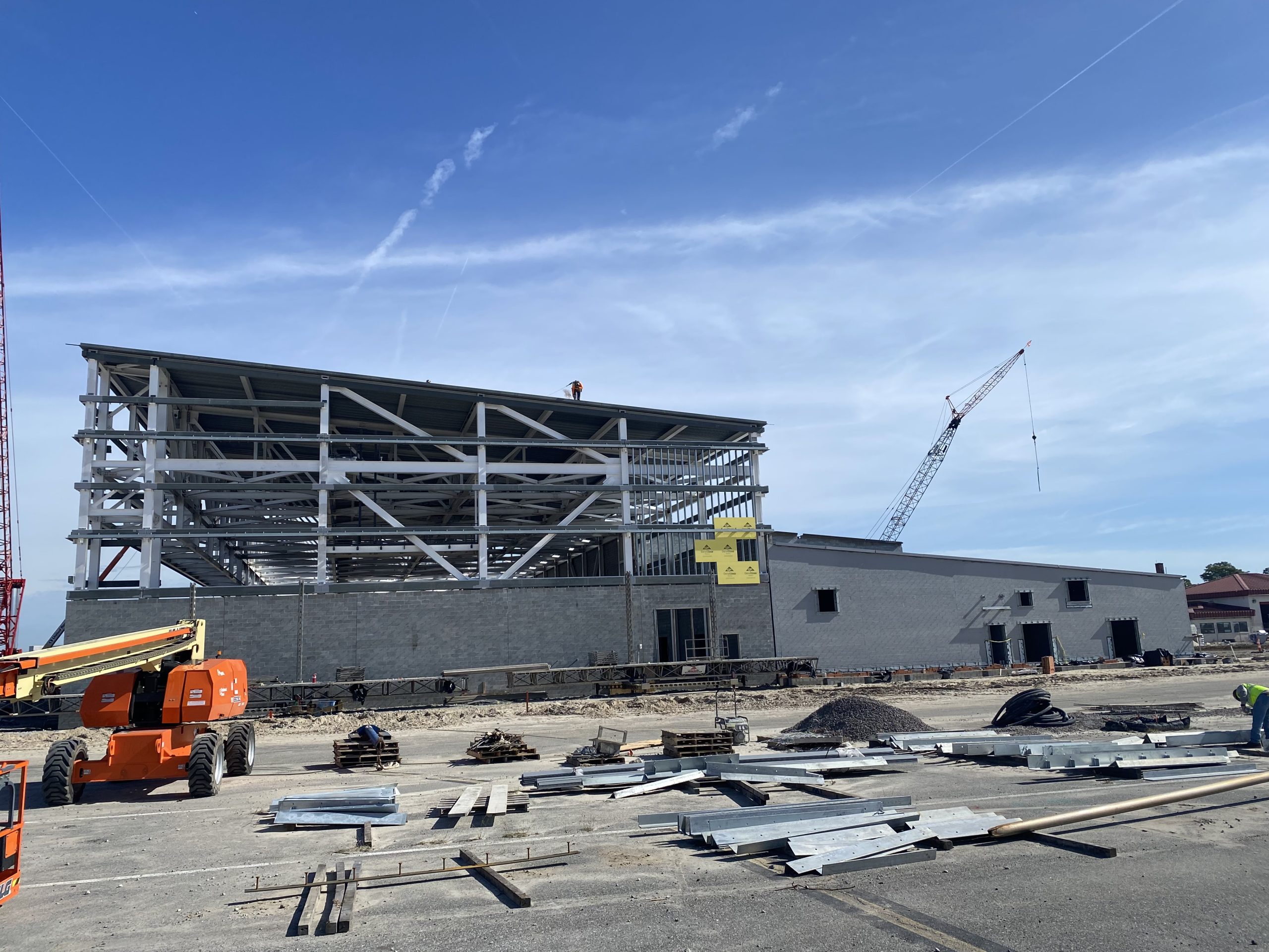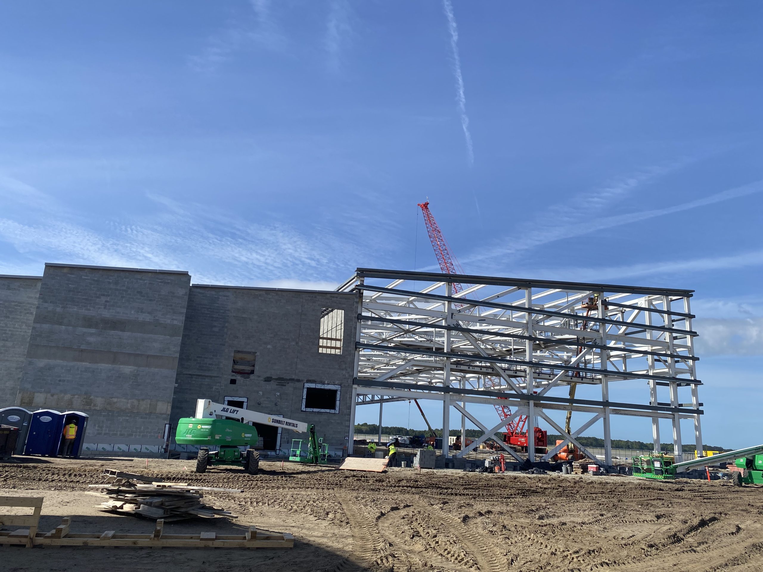 This hangar project on Hunter Army Air Field features deep, long span trusses running perpindicular to one-another. NAFCO used a mix of shop and field assembled trusses and provided shop application of the sophisticated military paint system to minimize field work. Hangar erection was completed in a duration of under 3 months.